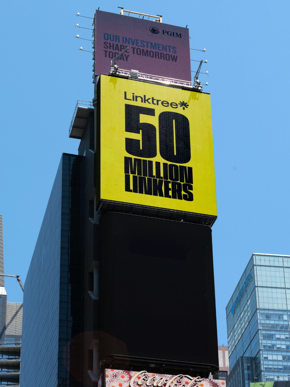 Linktree needed a spectacular way to announce its milestone of 50 million Linkers. Linktree's community includes a diverse and passionate user base, from celebrities to everyday creators. We had to craft a campaign that transcended mere brand promotion and became part of a larger narrative. I led the motion design across all digital out-of-home (DOOH) platforms to bring this vision to life.